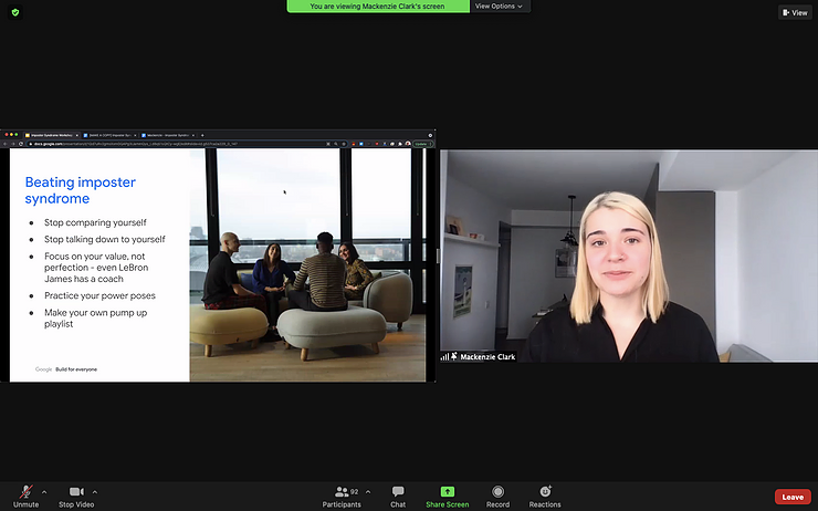 a crowd excited and very interactive. She talked about Imposter syndrome which is something new I learned today. It is the constant feeling of thinking that you don't belong and that luck had your side in whatever good things you have accomplished. I think it was great that she mentioned this as a way to show that it happens to the best of us since it was something that affected her but she strived past that and now is happily working for google. I think her mentioning this made a bunch of us including me, realize that we all think like that sometimes but it does not mean that all those thoughts are true but instead they are the bars we are setting for ourselves which can end up making us more accomplished